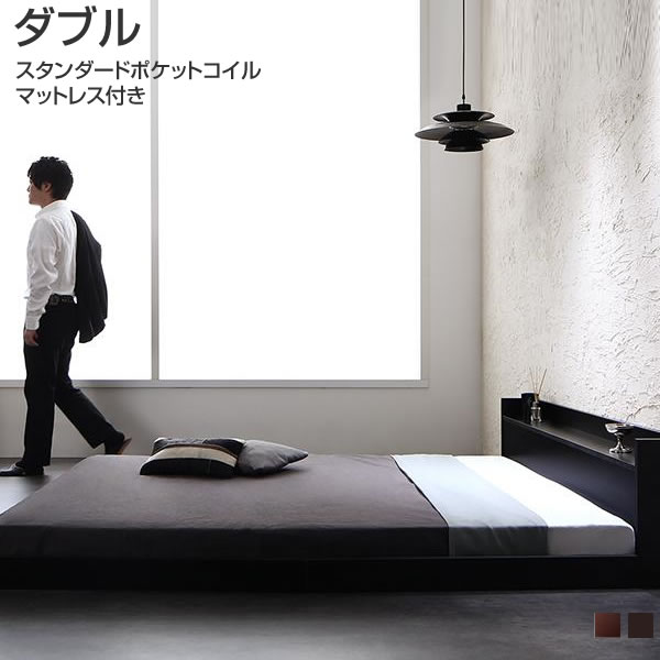 ローベッド ダブル ベッド マットレスセット コンセント付き ダブルベッド フロアベット ヘッドボード シンプル フロアタイプ 木製ベッド 低いベッド 棚付き 宮付き ロータイプ ロー ローベット一人暮らし かっこいい おしゃれ スタンダードポケットコイルマットレス付き